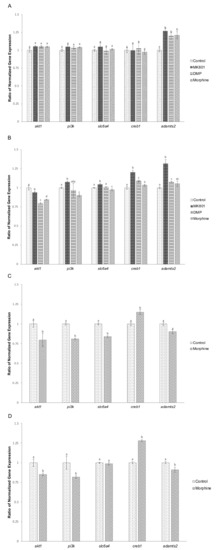 In animal models such as rodents, the most common pharmacological strategy to elicit schizophrenia-like behaviors is based on the inhibition of N-methyl-D-aspartate (NMDA) receptor [44] using MK801, a non-competitive NMDA receptor antagonist [45]. This drug is able to mimic the hypofunction of NMDA receptor [46], which leads to behavioural effects that resemble the full spectrum of positive, negative, and cognitive symptoms of schizophrenia [47,48]. These key outcomes induced by MK801 were replicated in zebrafish, supporting previous studies and the use of zebrafish to study schizophrenia-related endophenotypes [49]. In this study, we assessed changes in the gene expression of zebrafish larvae subjected to both short- and long-term exposure to DMP and morphine. In this way, we could verify whether the gene expression changes in the PI3K–AKT signalling pathway will lead to biochemical and behavioural changes associated with schizophrenia, opioid addiction, and opioid withdrawal.