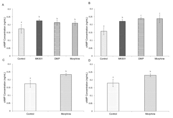 Effects of (A) short-term (F (3,32) = 22.035, p < 0.001) and (B) long-term (F (3,32) = 108.164, p < 0.001) exposure to MK801, DMP and morphine, and (C) short-term (t (16) = 12.465, p = 0.003) (D) and long-term (t (16) = 9.964, p = 0.029) morphine withdrawal on whole-body cAMP concentration (ng/mL) in zebrafish larvae. Data expressed as mean ± SEM, n = 50 of 3 independent experiments. Different lowercase letters indicate statistically significant values, p < 0.05. cAMP: cyclic adenosine monophosphate, DMP: domperidone.