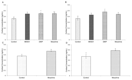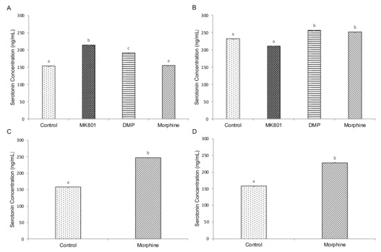 Biochemical experiments were performed to elicit alterations of cAMP, cortisol and serotonin and further provide insight into the effects of drugs on related pathways. Three-and five-day exposure with MK801, DMP and morphine significantly increased cAMP (Figure 3A,B) and cortisol (Figure 4A,B) levels. Similarly, cAMP (Figure 3C,D) and cortisol (Figure 4C,D) levels were significantly increased after short- and long-term morphine exposure followed by 5-day withdrawal. On the other hand, serotonin levels were increased in larvae after 3-day exposure to MK801 and DMP, but morphine had no effect (Figure 5A). Under the longer exposure regime, treatment with DMP and morphine had a significant effect on serotonin levels, but there was no effect in the MK801-treated group (Figure 5B). In the morphine withdrawal groups, serotonin levels were significantly increased (Figure 5C,D).