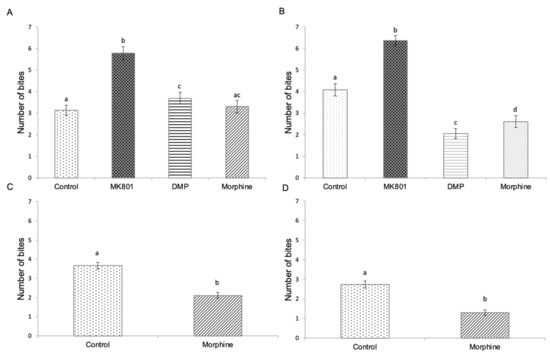 To evaluate the zebrafish aggressiveness level, a mirror biting assay was conducted. Larvae treated with MK801 for short- and long-term periods exhibited significantly higher mirror biting scores as compared to other groups (Figure 6A,B). Short-term exposure to DMP also induced a significant increase in mirror biting behaviour (Figure 6A), while long-term exposure to DMP suppressed the mirror biting score (Figure 6B). In morphine-treated groups, the frequency of mirror biting was only reduced in the long-term exposed group (Figure 6B). In the morphine-withdrawn larvae, the mirror biting behaviour was significantly decreased (Figure 6C,D).