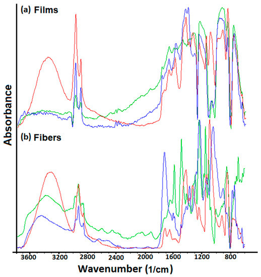 ATR-FTIR spectra of studied samples organized as films (a) and fibers (b) for PSFQ-green, CAP-blue, PVA-red.