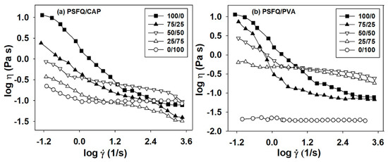 Double–logarithmic plots of dynamic viscosity (η) versus shear rate () for: (a) PSFQ/CAP and (b) PSFQ/PVA blends at various mixing ratios (wt./wt.) at 25 °C.