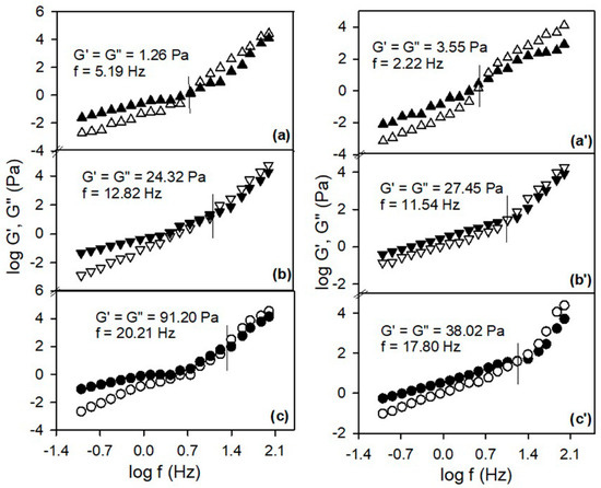 Double–logarithmic plots of shear moduli versus oscillatory frequency (f) at various mixing ratios (wt./wt.) for PSFQ/CAP (a–c) and PSFQ/PVA (a’–c’) blends at 25 °C. (a,a’) 75/25 ( (∆), (▲)); (b,b’) 50/50 ( (▽), (▼)); (c,c’) 25/75 ( (○), (●)).