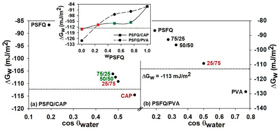 It is known that the flexibility of polymers is closely related with their hydrophilicity, so besides the rheological studies, in order to design blends based on quaternized polysulfones as biomaterials, the interpretation of their surface characteristics and control of physical or/and chemical modificationsmust be taken into account. Generally, their biocompatibility is mainly affected by the surface characteristics, including hydrophilic/hydrophobic balance of the surface, distribution and functionality, and surface smoothness [32]. Hence, the evaluation of the hydrophobic/hydrophilic balance is essential for studying the compounds used as biomaterials with different applications in biomedicine and biotechnology. In particular, as is shown in the rheological studies, the modification of surface functional groups—as a result of change in the polymer blends composition and polymers nature from the casting solutions (PSFQ/CAP and PSFQ/PVA)—leads to an increase in flexibility and workability of the films. Therefore, this modification plays an important role in biomedical applications because the changes can be used to adapt the surface to the desired characteristics without compromising its bulk properties. Thus, the effect of the different functional groups on the surface properties was evaluated from water contact angle measurements () by surface free energy, , (Equation (1) using the total surface tension of water, = 72.80 mN/m [33])) which expresses the balance between the surface hydrophobicity and hydrophilicity.