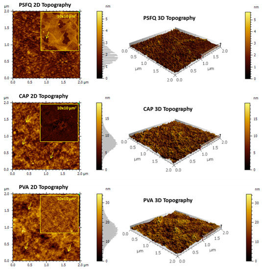 Analysing the texture of the samples recorded by 3D and 2D AFM images, different morphologies are observed (Figure 6 and Figure 7) highlighting that the nature and composition of the polymers incorporated in the PSFQ matrix (CAP and/or PVA) are responsible for the formation of areas with pores and grains of different sizes and densities. In accordance with the above mentioned, the AFM image recorded for PSFQ (Figure 6) indicates the appearance of irregular, porous formations, randomly disposed in some areas, (the average diameter of these pores being of 2.16 ± 0.28 μm). Instead, in the case of CAP and PVA samples (Figure 6), the AFM images show a well-balanced surface relief with a nanoporous structure aspect (hardly observable on the 10 × 10 μm2 areas—inserted images). This change is in accordance with the previous statements regarding the flexibility and hydrophilicity of the samples. The average diameter of the nanopores detected and calculated using the Pore Analysis Module was 56 ± 17 nm for the CAP sample and 78 ± 15 nm for the PVA sample. Some of them are evidenced using arrows in Figure 6.