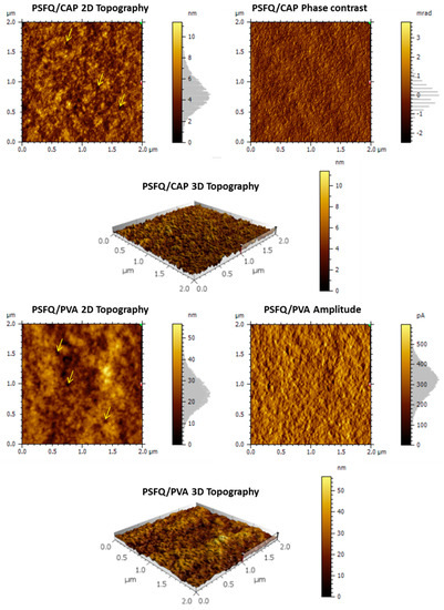 2D and 3D AFM topography images and phase contrast/amplitude images of the PSFQ/CAP and PSFQ/PVA blends at 25/75 mixing ratios (wt./wt.).
