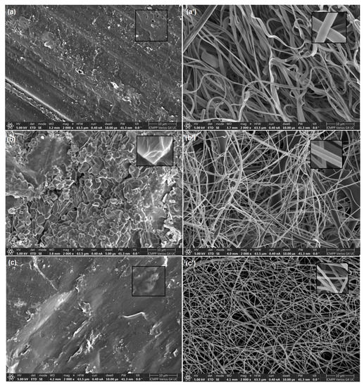 On the other hand, the electrospinning of PSFQ, CAP, and PVA solutions gave continuous cylindrical and thin fibers that were defect-free and randomly-oriented with inter-related voids among the fibers (Figure 8a’–c’). The examination of SEM micrographs revealed that PSFQ fiber (Figure 8a’) present loose smooth fibers with silky ribbon-like shape, with the width around 1 micron and average length over 150 microns. The surface of the PSFQ fibers is homogeneous with no roughness. Meanwhile, the CAP fiber (Figure 8b’) consists of loose fibers with overall tubular structure with the fiber radius of around 200 nm and average fiber length over 50 microns. The surface of the fibers shows roughness with wave-like ripples perpendicular to the fiber axis. As can be seen in the Figure 8c’, the PVA fiber consists in close-layered fibers with the fiber radius of around 200 nm and average fiber length over 100 microns. The surface of the fibers shows homogeneous aspect with no roughness. The differences between the morphology and polymers form have a relevant contribution to their behavior as biomaterials.