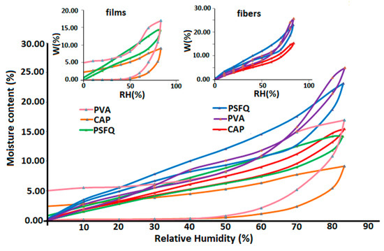 Sorption–desorption isotherms for studied polymers, in form of film and fiber. Small graphs have been inserted for better visualization depending on the processing mode. Registration conditions: equilibrium time 30/60 min.