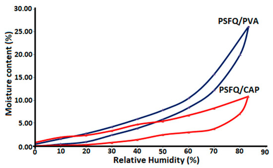 Sorption-desorption isotherms for the PSFQ/CAP and PSFQ/PVA studied blends at 25/75 mixing ratios (wt./wt.).