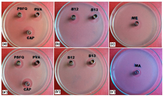 Testing the antibacterial activity of studied materials and their blends (70/30 wt./wt. composition of PSFQ/PVA and PSFQ/CAP blends, noted B12 and B13, respectively) at concentration of 0.5 g/dL against E. coli (a,b) and S. aureus (a’,b’)). In figure was presented images recorded for NMP used as a control sample (noted ME (c) and MA (c’)).