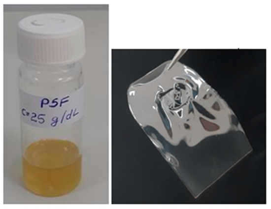 The films used in this study (thickness around 40 μm) were obtained by solution-casting method. The process of the obtaining, presented in detail in the previous study [18,26], involves the dissolution of the studied polymers (PSFQ, CAP, PVA) in NMP, obtaining of the homogeneous solutions of 25 g/dL concentration. Moreover, the blends in various ratios were obtained by mixing the two homogeneous solutions (PSFQ with CAP and PSFQ with PVA) by controlling the weight ratio. Finally, the homogeneous solutions thus prepared were cast onto a smooth glass substrate, and solvent has evaporated the appropriate films being formed (illustrated in Figure 12 for the PSFQ solution and film).