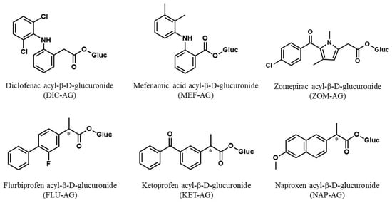 - Shimada, H.; Kobayashi, Y.; Tanahashi, S.; Kawase, A.; Ogiso, T.; Iwaki, M. Correlation between Glucuronidation and Covalent Adducts Formation with Proteins of Nonsteroidal Anti-Inflammatory Drugs. Eur. J. Pharm. Sci. 2018, 112, 132–138. [Google Scholar] [CrossRef]