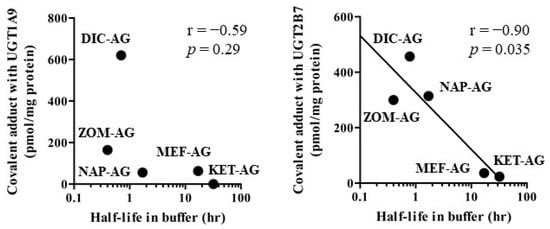 Chicago/Turabian StyleKawase, Atsushi, Rio Yamashita, Tsubasa Yoshizato, Mashiro Yoshikawa, Hiroaki Shimada, and Masahiro Iwaki. 2022. "Stereoselective Covalent Adduct Formation of Acyl Glucuronide Metabolite of Nonsteroidal Anti-Inflammatory Drugs with UDP-Glucuronosyltransferase" International Journal of Molecular Sciences 23, no. 9: 4724. https://doi.org/10.3390/ijms23094724