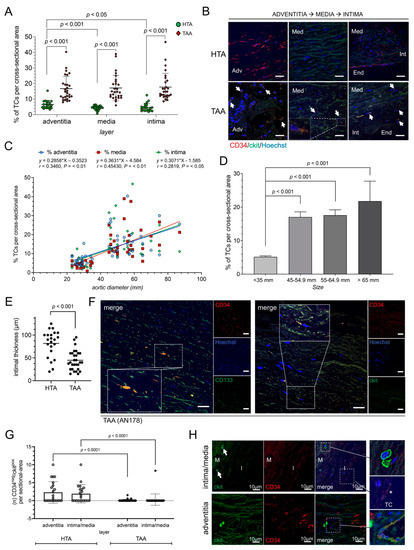 We identified significantly more CD34+/ckit+ TCs in tissue from TAA patients (n = 29) compared to HTA samples (n = 23) (Figure 1A). In detail, we observed an increase of TCs in adventitial, medial, and intimal layers of the diseased aorta (p < 0.001) (Figure 1A,B). The highest percentage increase in TC number was detected in the intimal layer of TAA samples (Figure 1A). Moreover, correlation studies show a significance in the number of TCs correlated to the aortic diameter, the higher the aortic diameter of aneurysmal aorta, the higher the presence of TCs (adventitia, R = 0.346 p < 0.01; media, R = 0.454 p < 0.01; intima, R = 0.2819 p < 0.05) (Figure 1C,D). Double staining of well-known TC markers (CD34, ckit, vimentin, and PDGFR-®), as well as the lack of endothelial marker CD31 confirmed TC specificity (Supplemental Figures S1 and S2). Notable, the thickness of the tunica intima showed a significant decrease after aneurysmal formation compared to healthy aorta (p < 0.001) (Figure 1E). In the non-aneurysmatic aorta of the HTA samples TC were predominantly found in the tunica adventitia as compared to tunica media and tunica intima (p < 0.001 and p < 0.05, respectively). This corresponds to our previous observations, where aortic TCs were mainly located in the adventitial layer and their perivascular network [28,32]. In summary, during aneurysmal formation and advanced stage of thoracic aortic disease, the number of TCs increased significantly with noticeable distribution of TCs to the intimal layer.