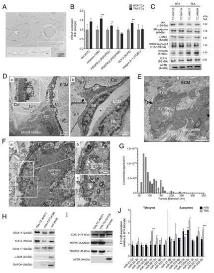 To further investigate various protein expression markers in HTA and TAA samples, TCs were isolated from HTA and TAA samples as previously described [8,9,28] (Figure 2A). Cells were sorted based on CD34 and ckit protein expression and purification of CD90 negative cells to distinguish TCs from dedifferentiated vSMCs or fibroblasts. After reaching ~80% of confluence at cell culture, we performed mRNA and protein analysis. The TC phenotype was characterized by mRNA expression of ckit, vimentin, PDGFR-α/-®, KLF-4, and CD29/integrin β–1 in TCs (Figure 2B). TCs isolated from TAA specimens showed a significant increase of vimentin (p < 0.01), PDGFR-α (p < 0.05), and KLF-4 (p < 0.01) compared to TCs isolated from HTA specimens. Moreover, Western blot analysis was conducted in two individual HTA-TC cell cultures and two individual TAA-TC cell cultures, to analyze protein levels of TC expression markers as well as vSMC-dedifferentiation markers (Figure 2C). This revealed higher protein levels of ‘contractile’ SMC-phenotype marker SM-calponin, α-SMA in HTA-TCs, whereby ‘synthetic’-marker vimentin and KLF-4 were decreased in HTA-TCs compared to TAA-TCs. Using TEM, we observed a close interaction of TCs via their telopodes with endothelial cells (ECs), fibroblasts (FBs), and vSMCs. Interestingly, we found exosome-containing multivesicular carriers (MC) primarily located in TC podomeres (Figure 2D(a)), suggesting a paracrine activity of TCs. Higher magnifications showed possible communication between TC and vSMC with synthetic phenotype morphology (Figure 2F(a–c)). We observed an invagination of telopodes by vSMC and formed caveolae close to the cell convergence of TC and vSMC.