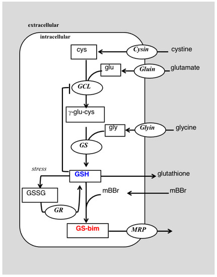 A portion of the glutathione metabolic network showing the reaction of cysteine (cys) and glutamate (glu) to form γ-glutamylcysteine (γ-glu-cys) in a reaction catalyzed by glutamyl cysteine ligase (GCL). Glutathione can act by feedback inhibition to slow GCL activity. The second step adds glycine (gly) in a reaction catalyzed by glutathione synthetase (GS) to form glutathione (GSH). Under oxidative stress GSH can be oxidized to its disulfide (GSSG) which can be reduced via glutathione reductase (GR) back to GSH. Glutathione can react spontaneously with monobromobimane (mBBr) or via an enzyme catalyzed reaction to form the glutathione-bimane conjugate (GS-bim) which may be extruded from the cell by the multi-drug resistance related protein (MRP).