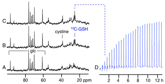 The time-course of label incorporation into glutathione is shown by acquiring and processing the data every 30 min (Figure 2D). Only the region of the spectrum containing the 13C-enriched glutathione signal is shown in Figure 2D and is plotted in blue in this Figure and subsequent time-course spectra. The data in Figure 2D reflects the increase in 13C fractional enrichment in glutathione upon the change from unlabeled to 13C-labeled cystine in the media and not a change in the intracellular glutathione content. We observed no other additional 13C resonances in these spectra from 13C-cyst(e)ine incorporation into other cellular components which is likely due to their low concentration.