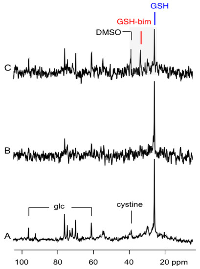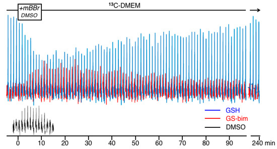 Time course of the 13C data collected in 1.2 min time intervals showing the region between 25–35 ppm just prior to, during and after exposure to media containing mBBr in DMSO. The box in the timeline above the spectra shows the time of exposure to mBBr. The resonances in blue are that for 13C-GSH at 25.8 ppm. The resonance in red is for the glutathione conjugate GS-bim detected at 33.6 ppm. For clarity, the resonances from the DMSO vehicle are plotted in black in the same time frame at the bottom of the figure.