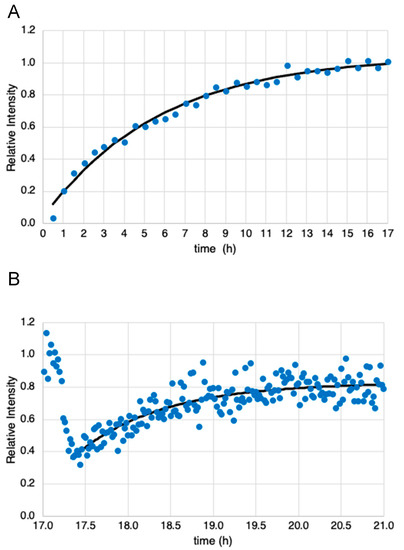 The data from one of three experiments showing the initial uptake of [3,3′-13C2]-cystine to produce 13C-GSH (i.e., Figure 2D) are shown in Figure 5A. This figure plots the integrated intensity of the 13C-GSH peak at 25.8 ppm as a function of time. Data from two other experiments are shown in Supplementary Figures S3 and S4. An exponential curve fit to the data is shown by the line in Figure 5A. Fitting the data from all three experiments yields a synthesis rate of 0.159 ± 0.023 h−1. The time course for mBBr-induced depletion of the 13C-GSH peak in one of three experiments using 1.2 min acquisitions (i.e., Figure 4), are shown in Figure 5B. The data from the other two experiments are shown in Supplementary Figures S5 and S6. Here the data is much noisier due to the lower signal-to-noise ratio obtained with the shorter acquisition. Since different cell numbers were used in each experiment, and flow characteristics of the fluidized bed varied the number of cells within the sensitive area of the probe, these data were normalized. All experiments detected an approximately 60% depletion in 13C-GSH signal upon introduction of the mBBr. All glutathione levels recovered to within 10% of the original level of 13C-GSH detected at the start of the experiments. The rate of glutathione resynthesis appeared much faster than the rates determined from the data in Figure 5A. Although the depletion and recovery kinetics are complex, an estimate of the recovery rate can be obtained if we fit an exponential equation to the recovery data and this is shown in Figure 5B. Fitting the data to all three recovery data sets yields a value of 1.09 ± 0.166 h−1 or >5-fold increase in rate.