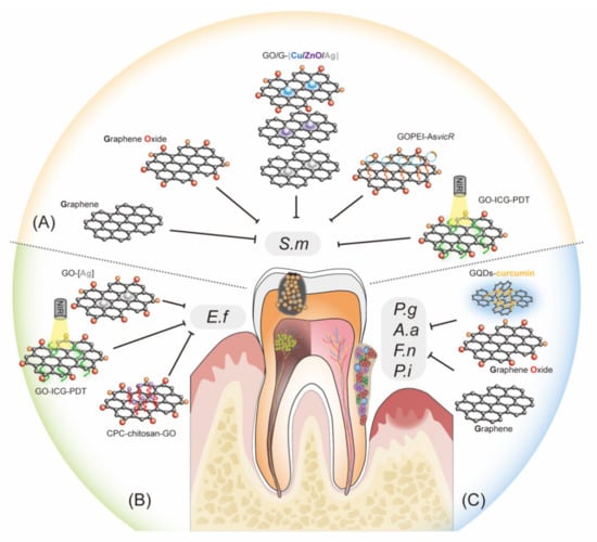 Porphyromonas gingivalis is regarded as a keystone periodontal pathogen, so it is the target bacteria for many new dental drugs and materials development research. GO nanosheets could effectively suppress the viability of P. gingivalis in a dose-dependent manner, stopping growth at a concentration of 40 μg/mL []. The mechanisms are involved in destroying the cell wall and membrane, thereby resulting in plasma leakage []. GO nanosheets could also inhibit the growth of Fusobacterium. nucleatum via a similar mechanism []. Thus, whether the inhibitory effect of GO nanosheets on periodontal pathogens is specific needs further investigation. Studies also demonstrated that graphene on a Ti surface could destroy the intact structures of polymicrobial biofilms, including P. gingivalis, F. nucleatum, and S. mutans []. The underlying mechanism regarding the bactericidal property might be elucidated as electron transfer from the bacterial biofilms to the graphene-reinforced sample, which disturbed the bacterial respiratory chain and led to a reduction in microbial viability []. GQDs coupled with curcumin could effectively suppress the viability of multiple biofilm formation capacity (76%) of peri-pathogens (Aggregatibacter actinomycetemcomitans, P. gingivalis, and Prevotella intermedia). This is associated with ROS generation and the downregulation of biofilm genes (rcpA, fimA, and inpA) []. The combined use of brush and a high concentration (≥256 μg/mL) of GO could eliminate residual bacteria and inhibit biofilms consisting of S. mutans, F. nucleatum, and P. gingivalis reformation on implants well, and the effect was significantly better than that of single use []. Taken together, these studies indicated that graphene and its derivatives could effectively suppress periodontal infection (Figure 1).