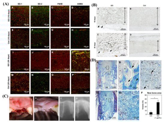 Graphene oxide (GO) coating on a collagen scaffold enhances alveolar bone regeneration. (A) Immunohistochemical assessment of subcutaneous tissue with scaffold implantation. ED1 and ED2 indicate macrophages, P4HB indicates fibroblasts, and ASMA indicates blood vessels, in red. I (B) Peroxidase staining of subcutaneous tissue implanted with scaffold. Arrows and double arrows indicate peroxidase-positive granulocytes and the implanted scaffold, respectively. (C) Photographs and radiographic images immediately and 2 weeks after the implantation of the GO scaffold (D) Histological assessments of new bone formation in the extraction socket at 2 weeks after scaffold implantation; arrows indicate residual GO. *, p < 0.05. [] Copyright 2016, the Author(s).