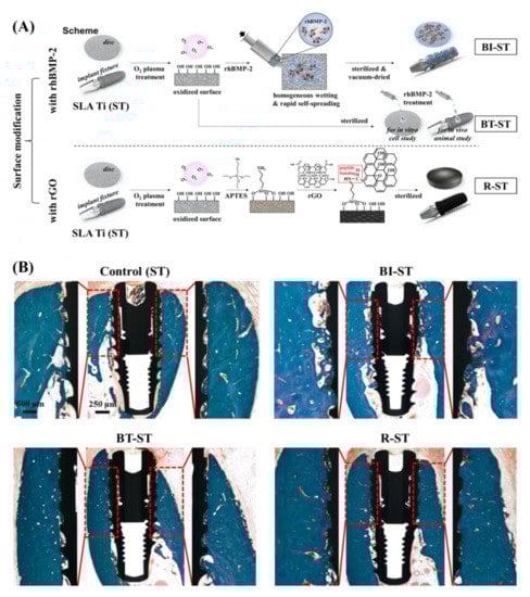 A reduced graphene oxide (rGO) coating enhanced the osseointegration of dental implants. (A) Scheme for surface modification of SLA Ti (ST) with rhBMP-2 immobilization (BI-ST) or treatment (BT-ST) and rGO coating (R-ST). (B) Histological assessment for osseointegration of implants via Goldner Trichrome staining; the region of interest for measurements of bone-to-implant contact length and intra-thread bone density is exhibited with higher magnification. [] Copyright 2022, the Author(s).