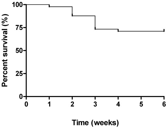 In this experimental procedure, the mortality rate is important to regulate the TNBS dose since the TNBS should induce the disease without inducing a high mortality rate. In this way, the survival curve was recorded, and it demonstrates a decrease in the survival rate in the first three weeks to approximately 73.3% (Figure 2). After week 4, the mice’s survival maintained the same value until the end of the experimental protocol, approximately 70.9%.