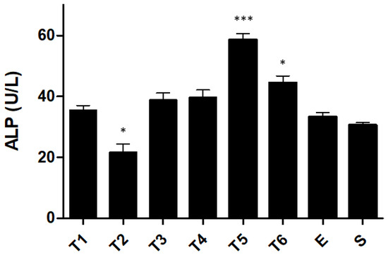 Due to its essential role in intestinal homeostasis, The ALP concentration in the blood was evaluated (Figure 5). In general, the ALP levels observed in the TNBS groups were higher than those observed in the control groups, with a maximum ALP level in the T5 group of 58.5 ± 2.2 U/L (p < 0.0001 compared with the ethanol group). After week 3, the maintenance of ALP values can be observed, with 39.7 ± 2.4 U/L in the T4 group and 44.4 ± 2.3 U/L in the T6 group and no statistical significance.