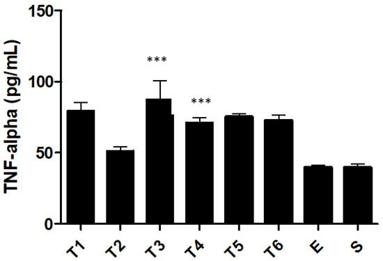 This animal model showed significant production of TNF-α, a pro-inflammatory cytokine, after TNBS administration (Figure 6). All TNBS groups presented higher levels of TNF-α than the control groups, except on week 2, where only a slight increase was observed. The T2 group presented 51.4 ± 2.9 pg/mL of TNF-α, while the ethanol group presented 39.8 ± 1.5 pg/mL, without statistical significance. The highest level of TNF-α was observed on week 3 (87.3 ± 13.1 pg/mL). However, on week 4, the T4 group verified a slight decrease to 71.3 ± 3.3 pg/mL, which indicates maintenance of the values over time when compared with the T6 group (72.7 ± 3.6 pg/mL), without statistical significance being observed. Compared with the ethanol group, the T4 group presented statistically significant differences (p < 0.0001).