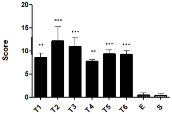 Concerning body weight monitoring, colitic mice presented a progressive increase in body weight throughout the experimental procedure, with a 10% increase in body weight since the induction day. Mice of the T6 group had a weight gain, after six administrations, consistent with previously reported results [26,29,30,31,32]. However, three weeks after the beginning of the experiment, the TNBS groups showed a decrease in body weight. This decrease may be related to the fragility of the mice following three TNBS administrations. However, a recovery in body weight occurred over the following weeks. This may be consistent with the fact that after the fourth administration mice gain resistance to TNBS.