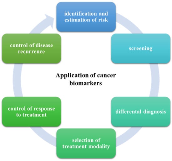 The National Cancer Institute defines a biomarker as a biological molecule present in body fluids or tissues that signals normal or abnormal processes, conditions, or diseases []. Over the years, knowledge of cancer biomarkers (CB) has increased, enabling improvements in efficient detection and the efficacy of treatments due to their wide range of applications (Figure 1) [].