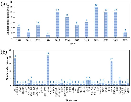 (a) Number of published articles during the period of 2011 to 2022 (February) based on Scopus, ScienceDirect, PubMed, Web of Science, and Google Scholar. (b) Number of biomarker occurrences in the published articles, where: AFP—α-fetoprotein; AFP-L3—lectin-reactive α-fetoprotein; ANG—angiogenin; B7-H6—B7-H6 protein; BLV—bovine leukemia virus antigen gp51; CA 125—carbohydrate antigen 125; CA 19-9—carbohydrate antigen 19-9; CA15-3—cancer antigen 15-3; CA27-29—cancer antigen 27-29; CD19—specific surface marker CD19; CD20—specific surface marker CD20; CD44V6—CD44 variant isoform 6; CEA—carcinoembryonic antigen; CK-19—cytokeratin-19; CTCs—circulating tumor cells; EpCAMs—epithelial cell adhesion molecules; exosomes—tumor-derived exosomes; FER- ferritin; hCE1—human carboxylesterase 1; HE4—human epididymis protein 4; HER2—human epidermal growth factor receptor 2; hK2—human kallikrein 2; IFN-γ—interferon gamma; IL-10—interleukin-10; IL-18—interleukin-18; IL-6—interleukin-6; IL-8—interleukin-8; MMP-7—matrix metalloproteinase-7; MMP-9—matrix metalloproteinase-9; MP—metanephrine; MUC4—mucin protein MUC4; NSE—neuron-specific enolase; OPN—osteopontin; p53—protein p53; PSA—prostate-specific antigen; PSMA—prostate-specific membrane antigen; Rac—adrenal stimulant ractopamine; SCCA—squamous cell carcinoma antigen; TNF-α—tumor necrosis factor α; VEGF—vascular endothelial growth factor.