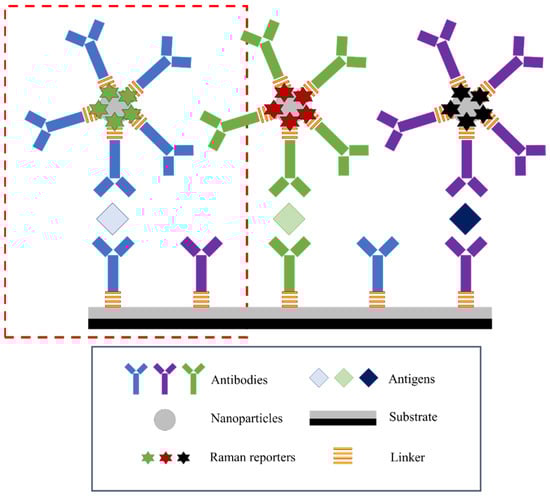 The general principle of operation is similar to the ELISA test. However, SERS tags are used instead of the enzyme. A unique approach to this issue is the use of two metallic substrates instead of one, creating a sensor with a double amplification potential, the so-called sandwich assay sensor. The general scheme of the SERS immunosensor is as follows: metallic substrate–antibody–antigen–antibody–metallic nanoparticle. Double amplification of the signal occurs due to the metallic substrate’s interaction with the attached nanoparticles through a specific antigen–antibody interaction. A schematic representation of the SERS sandwich immunosensor is shown in Figure 3. This figure is presented in a multiplexed version, enabling the detection of three antigens representing different disease biomarkers. At the same time, the simplest and most frequently used version of the sensor relating to the analysis of a single antigen is marked (red box).
