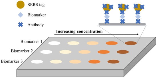 Li and coworkers reported an immunoassay for multiplexed detection of breast cancer antigens (CA 15-3 and CA 27-29) and the cancer embryonic antigen []. Immunoassay preparation involved gold nanostars modified with 4-nitrothiophenol as the Raman reporter and coated with SiO2 and antibodies corresponding to cancer antigens. Quartz SERS chips (SERS substrates) were also conjugated with antibodies. The linear response toward the concentrations of CA 15-3 and CA 27-29 was recorded between 0.1 U mL−1 and 500 U mL−1, while for CEA, the linear range was 0.1 ng mL−1 to 500 ng mL−1. The limits of detection were calculated to be 0.99 U mL−1, 0.13 U mL−1, and 0.05 ng mL−1 for CA 15-3, CA 27-29, and CEA, respectively. Results of the analysis of spiked fetal bovine serum showed that the proposed immunoassay enabled accurate determination of the aforementioned biomarkers due to high convergence with reference concentrations.