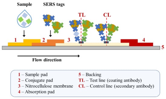 Xia et al. reported a SERS-based lateral flow immunoassay to detect the squamous cell carcinoma antigen and cancer antigen 125 (CA125), markers for a cervical cancer diagnosis []. To prepare two SERS immunoprobes, nitrocellulose membrane was modified with Raman reporters (4-aminothiophenol and 5,5-dithiobis-(2-nitrobenzoic acid)) and antibodies. The LOD values for SCCA and CA125 were equal to 7.156 pg mL−1 and 7.182 pg mL−1, respectively. The same parameter values determined in human serum were 8.093 pg mL−1 (for SCCA) and 7.370 pg mL−1 (for CA125). An analysis of clinical serum samples enabled an accurate assessment. The obtained results were in good agreement with the ELISA.