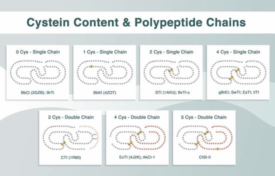 - Bendre, A.D.; Ramasamy, S.; Suresh, C.G. Analysis of Kunitz inhibitors from plants for comprehensive structural and functional insights. Int. J. Biol. Macromol. 2018, 113, 933–943. [Google Scholar] [CrossRef]