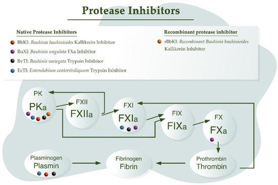 Numerous plant-derived inhibitors acting on different proteases (released by leukocytes) in the coagulation cascade have been described in more recent studies (Figure 2), such as EcTI, a multispecific inhibitor that acts on PKa, plasmin, human neutrophil elastase, and factor XIIa. It does not, however, inhibit thrombin, human plasmin, or factor Xa (FXa) [93,94].