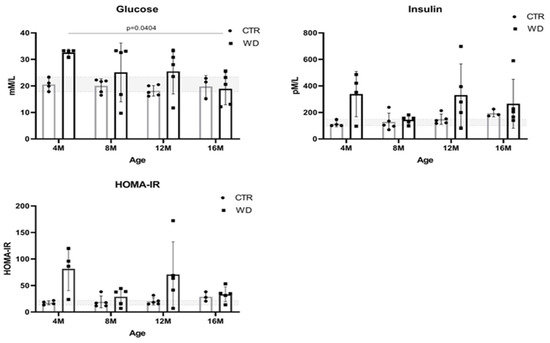 Plasma glucose and insulin levels and HOMA-IR values in C57BL/6J mice fed with a Western diet (WD) and standard diet (SD) in four age groups (4M, 8M, 12M, and 16M). The designated gray boxes show the reference range determined from minimum and maximum values parameters obtained in young (4M) C57BL/6J mice fed standard feed (CTR). Statistical analysis comprised the Shapiro–Wilk normality test, two-way ANOVA, and Tukey’s post hoc test. Significant result: glucose: (4M WD vs. 16M WD (p-Value = 0.0404)). (Completed statistical data in Supplementary Materials Table S1).