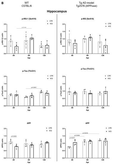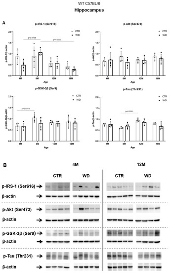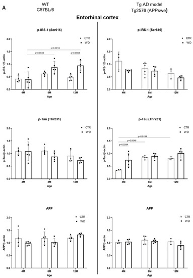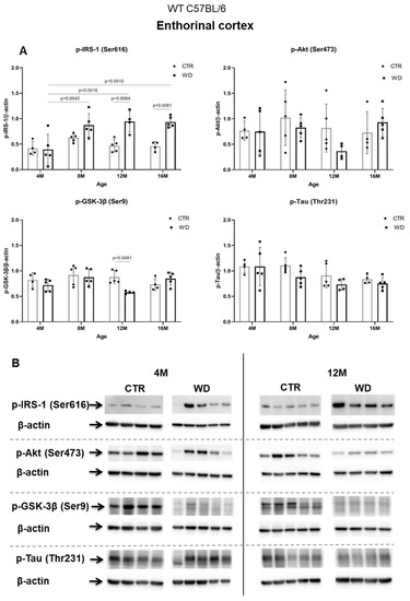 The aim of this study was to verify the hypothesis that WD, by inducing insulin resistance in the brain, can trigger the initiation and propagation of major neuropathological features of AD, such as Aβ plaques and neurofibrillary tangles. To this aim, male C57BL/6J wild-type (WT) mice were fed a WD or standard diet (SD; CTR) from 3 months of age. The effects of WD on brain levels of the insulin signaling pathway components, p-IRS-1(Ser616), p-Akt(473), and p-GSK-3β(Ser9), and on neuropathological AD biomarkers, p-Tau(Thr231) and APP/Aβ levels, were analyzed in animals at 4, 8, 12, and 16 months of age (animal groups 4M, 8M, 12M, and 16M). Levels of these proteins were assessed in two brain structures characteristic of the preclinical, pre-symptomatic stages of AD development—the entorhinal cortex and the hippocampus.