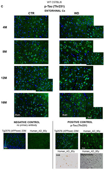 Consistent with the results obtained from Western blotting (Figure 2A,B), the immunofluorescence analysis of sections from the entorhinal cortex area using an anti-p-Tau(Thr231) antibody showed no significant differences under WD (Figure 2C). Although there were no differences in the p-Tau(Thr231) levels, we observed accelerated changes in the localization of the p-Tau(Thr231) isoform in subcellular compartments. The analysis in the youngest groups of animals (4M WD and 4M CTR) revealed a typical pattern of tau protein labeling, both along the course of nerve fibers and in the layer of cytoplasm surrounding the cell nucleus. In 8-month-old mice, such a labeling pattern of p-Tau(Thr231) was observed only in control animals (8M CTR). In contrast, in the 8M WD group, disruption of p-Tau(Thr231) labeling in fibers and restriction of immunostaining mainly to neuronal cell bodies was observed, indicating impairment of normal tau function and dissociation of this protein from microtubules (Figure 2C). In control mice, this phenomenon was age related and appeared in the group of 12-month-old mice (12M CTR) and later in 16-month-old mice (16M CTR).