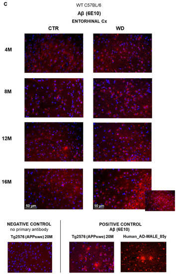 The levels of full-length APP in the entorhinal cortex and in the hippocampus of WT C57BL/6J mice. (A) Quantification and statistical analysis. (B) Representative source Western blots. Statistical analysis comprised the Shapiro–Wilk normality test, two-way ANOVA, and Tukey’s post hoc test; significant results: Entorhinal cortex APP: (4M WD vs. 16M WD (p-Value = 0.0314); 8M WD vs. 16M WD (p-Value = 0.0113); 12M WD vs. 16M WD (p-Value < 0.0001); Hippocampus APP: (4M CTR vs. 4M WD (p-Value = 0.0424)). The source figures from Western blot analysis are attached in Appendix A: Figure A3a,b; completed statistical data are in Supplementary Materials Table S3. (C) Microphotographs showing preparations from the entorhinal cortex of C57BL/6 mouse brains from groups at 4, 8, 12, and 16 months old, immunofluorescently labeled with an antibody recognizing the Aβ peptide. Negative and positive controls to staining specificity were performed in 20-month-old animals of transgenic mouse model of AD—Tg2576 (APPswe) and a diagnosed human AD patient. Magnification 400×.
