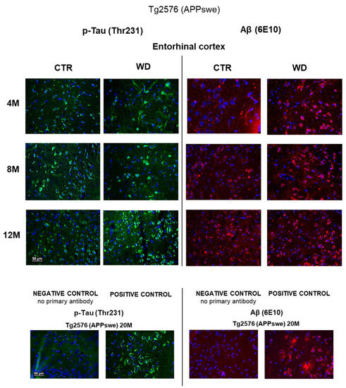 p-Tau(Thr231) and Aβ immunostaining in the entorhinal cortex of the transgenic mouse model of AD in three age groups—4M, 8M, and 12M. Negative and positive controls to staining specificity were performed in 20-month-old transgenic AD model mice—Tg2576 (APPswe). Magnification 400×.