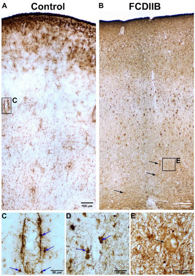 Glial fibrillary acidic protein (GFAP)-immunopositive elements in a control sample (A,C) and in an epileptic patient with FCDIIB in the frontal cortex (B,D,E). In the control sample, GFAP-labeled glial cells show loose distribution except in the first layer (A) and they are more frequent around blood vessels (A,C). Blue arrows show the GFAP-immunopositive glial cells (astrocytes). The amount of GFAP-immunopositive elements are increased in the dysplastic cortex (B,D). Both the number of cells and-their processes are also increased (gliosis) (B,D) compared to the control sample (A,C). The astrocytes are abnormally large, their processes are thicker and shorter (D). There are presumable balloon cells in the white matter and layer VI (E). Black arrows show the GFAP-immunopositive presumable balloon cells (B,E). Scales: (A,B): 100 µm (C–E): 50 µm, focused images.