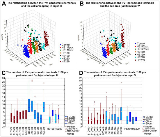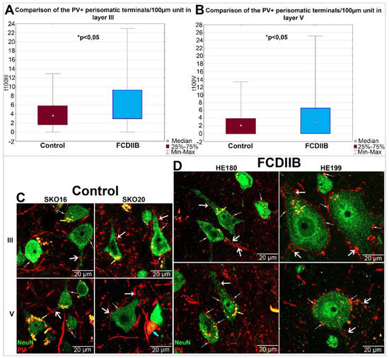 Data from FCDIIB and control samples were pooled per layer and the number of PV-immunopositive perisomatic terminals per unit-perimeter was compared using the Mann–Whitney U test. A comparison of pooled data showed that the number of perisomatic PV-immunopositive terminals per unit-perimeter is significantly higher in FCD cases: Layer III: Mann–Whitney U = 35,088, N1 = 336, N2 = 327, p = 6.89 × 10−16; Layer V: Mann–Whitney U = 41,020, N1 = 332, N2 = 331, p = 7.06 × 10−9 (Figure 4A,B).
