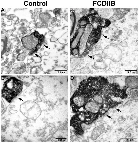 An important feature of the FCDIIB pathology is the presence of dysmorphic and hypertrophic neurons with abnormal morphology and enlarged cell bodies in the cortex [1,3,21,24]. Cells with abnormal size and morphology were found in our FCDIIB samples (Figure 1B,E, Figure 3E,F and Figure 4D), they are referred to as “giant” principal cells. The giant neurons were present mostly in layers III and V (Figure 1B,F, Figure 3E and Figure 4D).