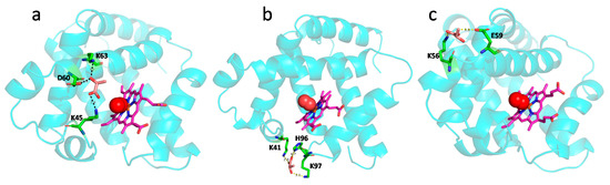 ITC studies also revealed the binding affinity (Ka, inverse of Kd) of LAC interaction with oxy- and deoxy-Mb in different pH conditions. Specifically, with the drop in pH from pH 7.0 to pH 6.0, the Ka of LAC for oxy-Mb was increased by ~3-fold, and for deoxy-Mb at pH 6.4, the Ka was ~2-fold higher than pH 6.0 (Table 1). The plausible reason might be due to a change in protonation states of Mb residues (in particular, histidine, His) in acidic pH conditions. Computational analysis revealed that Mb net charge (pKa) was increased with decreasing pH, i.e., pKa of ~2.6, ~6.3, and ~8.9 at pH 7.0, pH 6.4, and pH 6.0, respectively. The protonation states of His residues in Mb were also increased with decreasing pH. At pH 7.0, no His residues were protonated, since the isoelectric pH (pI) of Mb was ~7.8. However, at pH 6.4, His36 was protonated and at pH 6.0, His residues at positions 36, 48, 81, 82, 97, and 226 were found to be protonated (Figure S2). Apart from the protonation sites, another compelling reason might be the change in the binding site of LAC during interaction with Mb in different pH conditions. It was also reported that Mb does not contain any specific binding location for LAC and LAC may act as an allosteric regulator [50]. Molecular docking studies revealed that LAC putatively binds to oxy-Mb at different locations with respect to changes in pH. Nevertheless, LAC binds near the distal His side of the heme center via hydrogen bonding interactions in all conditions, except for oxy-Mb at pH 6.0 (Figure 2). In oxy-Mb, at pH 7.0, LAC is docked near the oxygen binding site (proximal His residue) of the heme center, interacting with the residues K45, D60, and K63 (Figure 2a). However, with the decrease in pH, LAC binds to oxy-Mb away from the heme binding site. At pH 6.4, LAC interacts with residues K41 and K97 near the heme binding site (Figure 2b), whereas at pH 6.0 LAC interacts with residues K56 and E59 away from heme binding center (Figure 2c). Irrespective of pH, LAC is docked near to proximal His side of the heme center of deoxy-Mb interacting with the residues H96 and S92 (Figure 3). No detectable binding of LAC with deoxy-Mb was observed at pH 7.0. Future studies involving molecular dynamics simulation and quantum mechanics will help in calculating the stability and binding energies of LAC interaction with oxy- and deoxy-Mb in various pH conditions to reveal more insights into the structural and conformational changes of all the Mb+LAC complex(es). However, the present ITC binding results and molecular docking predictions strengthen our hypotheses related to different affinities of oxy-Mb toward LAC in varied pH conditions. In parallel, ITC binding experiments were also validated with a control protein, LYZ, that showed no detectable binding with LAC in all the tested pH conditions (Figure S3a–c). Our results contrast with the earlier studies by Giardina et al., in which binding studies were performed at pH 6.5 and showed that LAC had a lower affinity for oxy-Mb than deoxy-Mb (Kd values: 26 × 103 µM vs. 2.5 × 103 µM, respectively) [50]. However, we found that LAC showed a higher affinity toward oxy-Mb compared to deoxy-Mb at pH 6.4 (~7 µM vs. ~14 µM, respectively; Table 1). One of the reasons for different results between the two studies might be differences in measuring thermodynamic binding. The earlier binding studies were determined spectrophotometrically using tonometry, whereas our binding kinetic studies were performed using an advanced ITC method that precisely reflects protein-ligand stoichiometry. Importantly, both studies concur in identifying LAC as a binding metabolite for Mb.