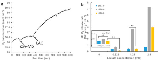 Effect of lactate binding to oxy-Mb and O2 release kinetics. Oxygen kinetics is studied using Oxytherm+ respirometer. All experiments were performed with 50 mM sodium phosphate buffer (pH 7.0, pH 6.4, and pH 6.0) containing 150 µM equine oxy-Mb and varying concentrations of lactate (0.625 mM to 2.5 mM) and oxy-Mb alone as a control. (a) A representative graph showing addition of lactate eliciting a rapid release of O2 from oxy-Mb at pH 6.4. Arrows in the figure indicate the point of addition of oxy-Mb and LAC into buffer during the run. (b) Rate of release of O2 from Mb against lactate concentrations with buffers (pH 7.0, pH 6.4, and pH 6.0). Inlet chart displays rate of release of O2 from deoxy-Mb alone (pre-LAC) conditions. All O2 kinetic experiments were repeated 3 times (n = 3). Statistical analysis was performed using one-way ANOVA and the Tukey–Kramer post hoc test. Statistical analysis revealed no significant difference in O2 release from oxy-Mb alone (without LAC) at pH 7.0 and pH 6.0. Additionally, no significant difference in O2 release was observed at pH 7.0 and pH 6.0 with 1.25 mM LAC condition. Moreover, with the addition of 0.625 mM LAC to oxy-Mb at pH 6.0, no significance difference in O2 release was observed when compared to oxy-Mb alone at pH 6.0. Among all the test groups, only statistically not significant groups are shown with horizontal lines and two asterisks.