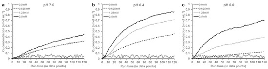 The O2 release at varying concentrations (0.0 mM, 0.625 mM, 1.25 mM, and 2.5 mM) of LAC at (a) pH 7.0, (b) pH 6.4, and (c) pH 6.0. The rate of O2 release was calculated from the linear portion of the graphs immediately after addition of LAC to oxy-Mb. Representative data from a single experiment per condition are shown here. All O2 kinetic experiments were repeated 3 times (n = 3).
