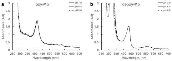 A representative UV-Vis spectra of freshly prepared (a) oxy-Mb and (b) deoxy-Mb samples each at pH 7.0, pH 6.4, and pH 6.0. Preparation of protein samples is detailed in the Materials and Methods section. All the spectra were repeated 3 times (n = 3).