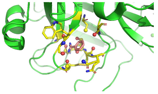 Definition of amino acid residues around the probe. Yellow residues are “amino acid residues around the probe”. Amino acid heavy atoms within 4 Å from any heavy atom of the probe molecule (red molecule) are shown as balls.